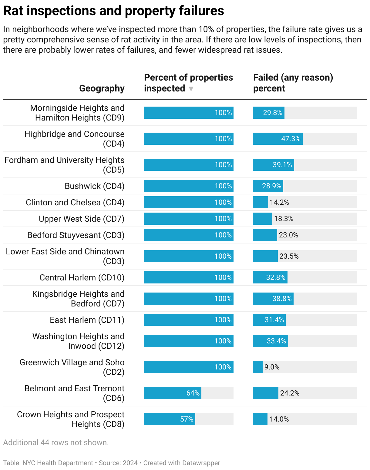 It shows us both the percentage of properties inspected in a neighborhood, and the percentage that failed inspections. These failures could be for active signs of rats or rat-friendly conditions like open trash.