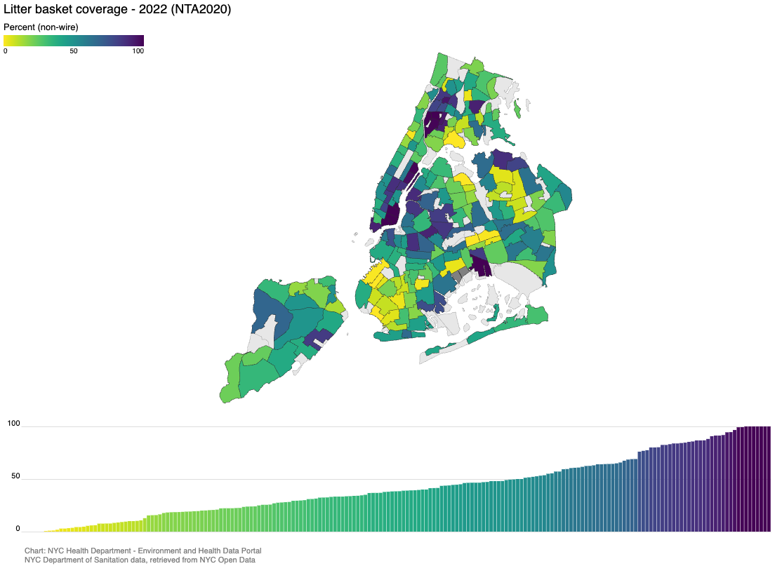 But sometimes we see something on NYC Open Data, or another source, that provides interesting context to NYC’s environment and health, for example, our litter basket coverage data. These humble amenities may be overlooked, but have a strong connection to health: when there are more litter baskets, there is less litter, and fewer pests. Fewer pests are healthier for a neighborhood and cleaner streets have a positive impact on mental health and feelings of safety and positivity. Public bathrooms also make it easier for people to partake in public life.